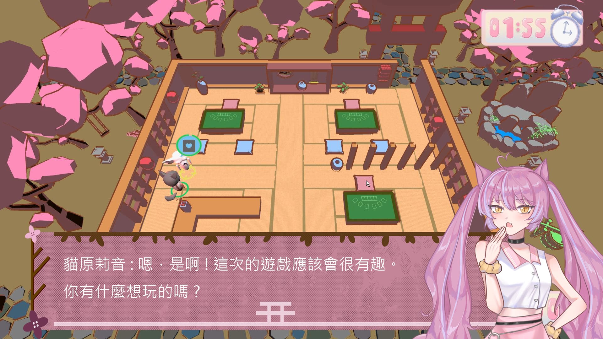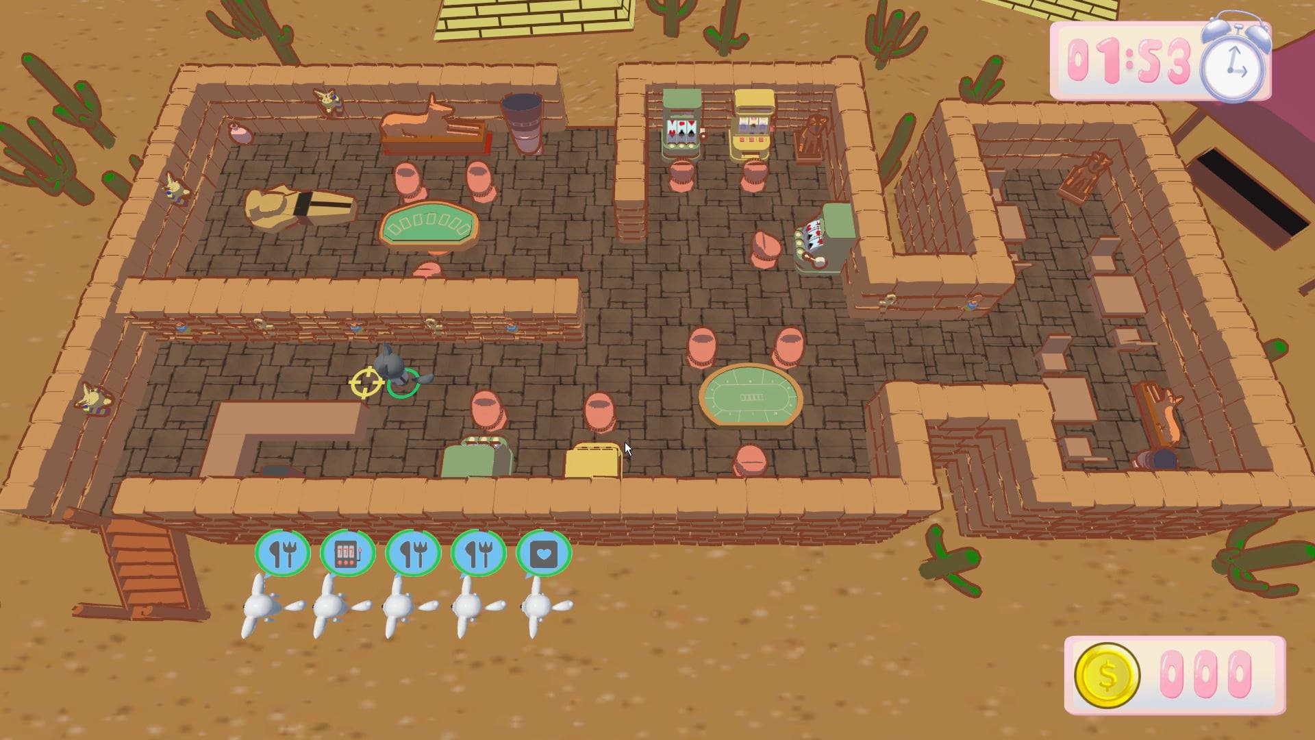 玩家透過操作角色,在場景中帶位(搬運)來訪的顧客,到介面上要求相對應的區域,等待顧客遊玩結束。