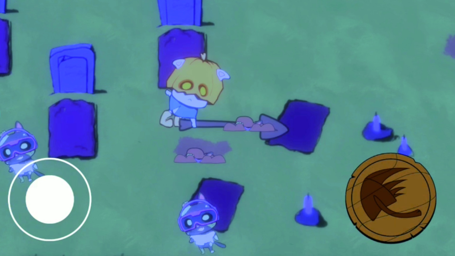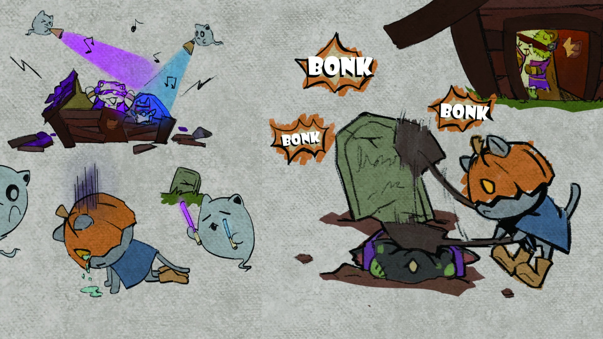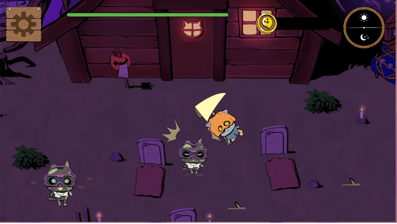 玩家扮演貓貓守墓人阻止想要開派對的殭屍們,白天要整修被他們破壞的房屋,只要完成幽靈們的心願收服他們,他們會在夜晚成為小員工,和你一同阻止拆家,把蹦迪殭屍敲回土裡吧!